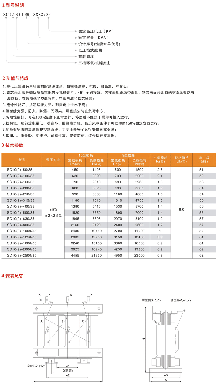 高低压绕组采用环氧树脂浇注成形,机械强度高,抗裂,耐高温,寿命长;铁芯采用高导磁优质晶粒取向冷扎硅钢片,45°全斜接缝,芯柱采用绝缘带绑扎,铁芯表面采用特殊树脂涂覆以防潮防锈,有效降低了空载损耗、空载电流和铁芯噪音;