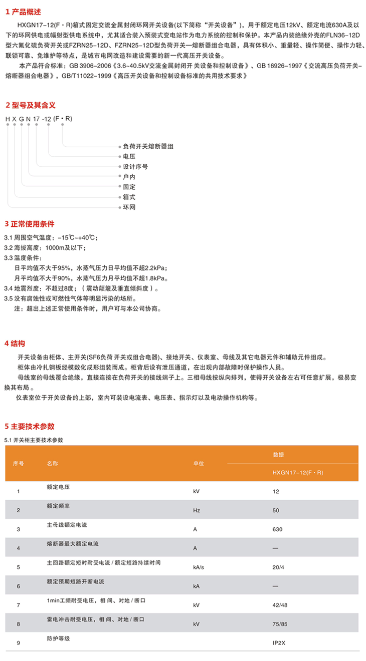 HXGN17-12(F·R)箱式固定交流金属封闭环网开关设备(以下简称“开关设备”),用于额定电压12kV、额定电流630A及以下的环网供电或幅射型供电系统中,尤其适合装入预装式变电站作为电力系统的控制和保护。本产品内装绝缘外壳的FLN36-12D型六氟化硫负荷开关或FZRN25-12D、FZRN25-12D型负荷开关━熔断器组合电器,具有体积小、重量轻、操作简便、操作力轻.联锁可靠、免维护等特点,是城市电网改造和建设需要的新一代高压开关设备。